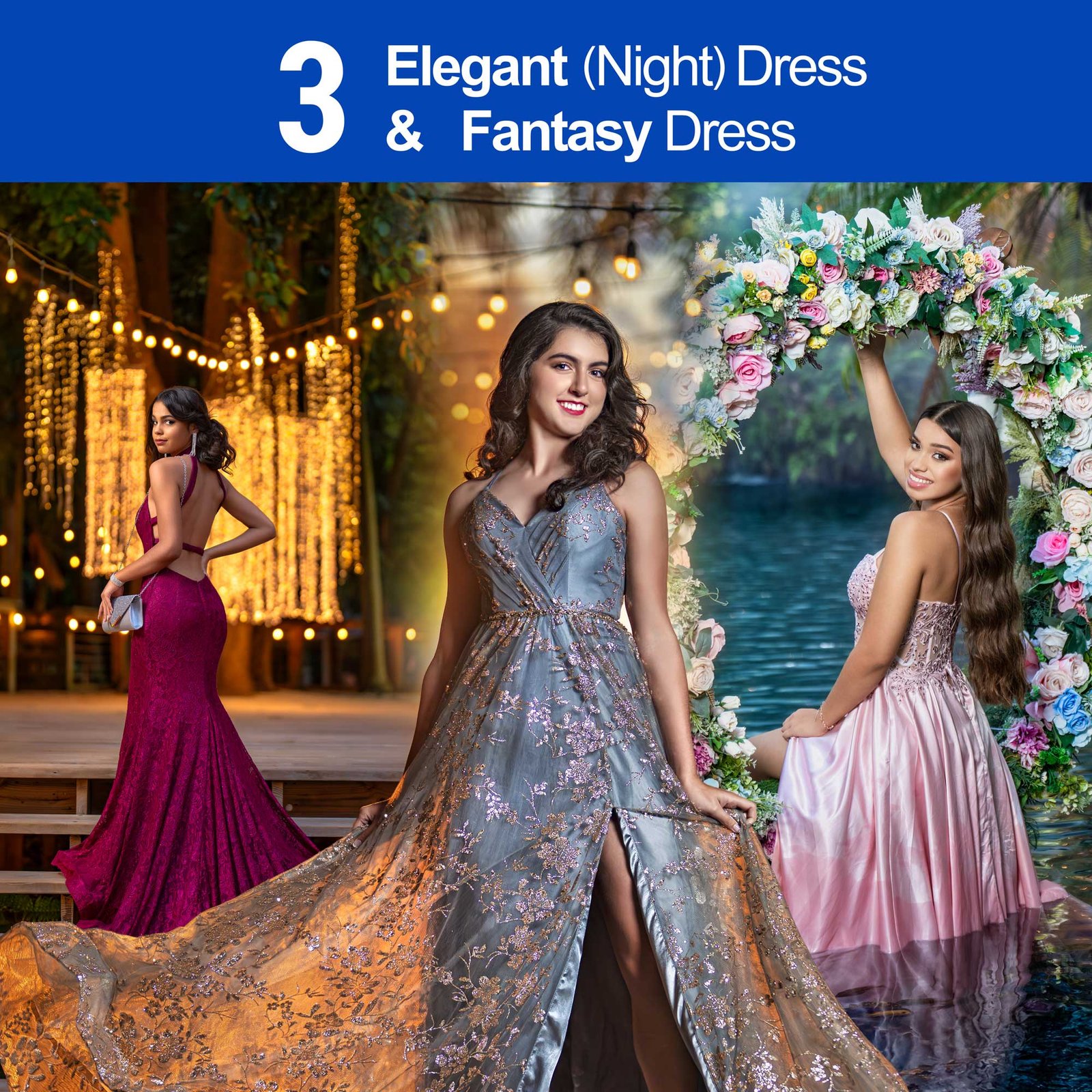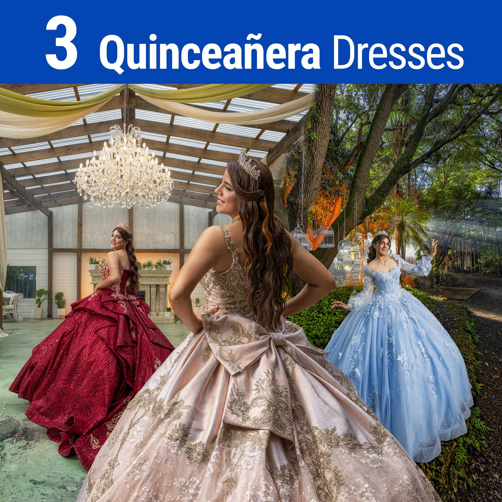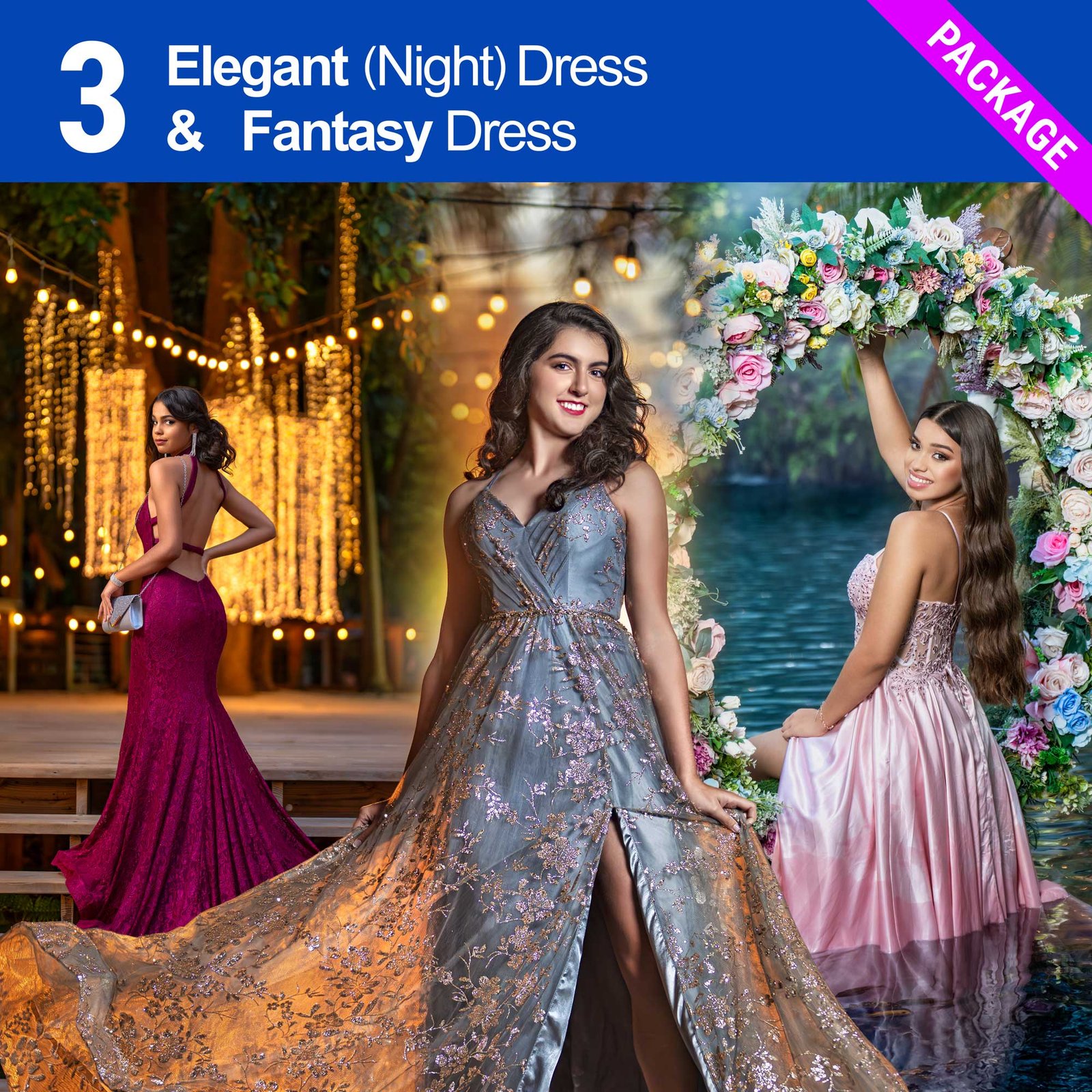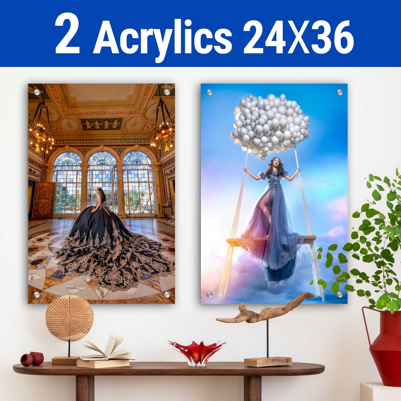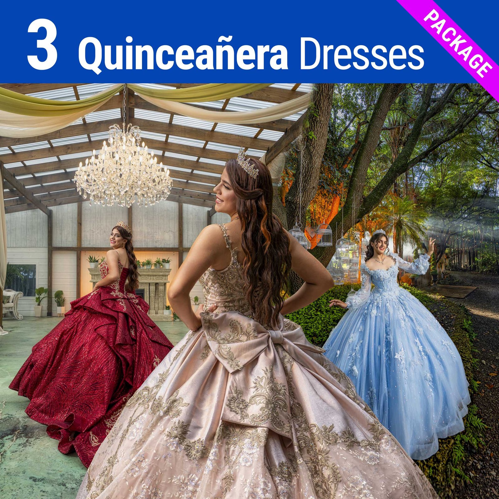 2 Acrylics 24X36 This package includes 3 Quinceañera dresses plus 3 Elegant or Fantasy dresses with accessories. These dresses are provided by our studio. In addition, you may bring up to 4 extra dresses from home.